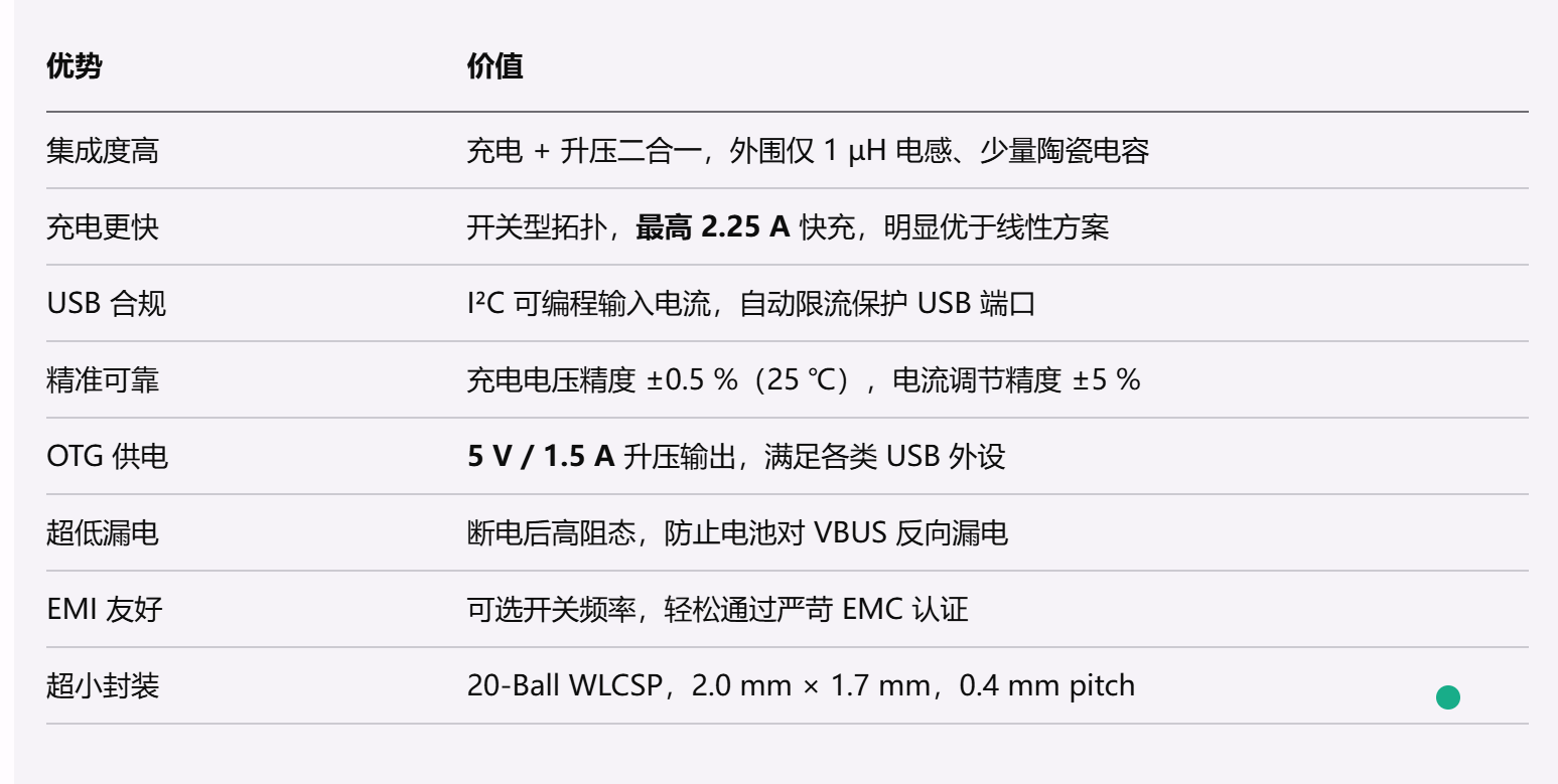 • 软启动 OTG 升压,限制电池涌流