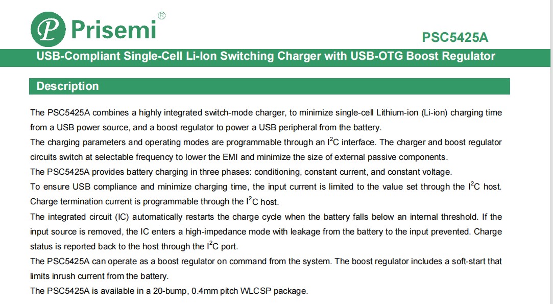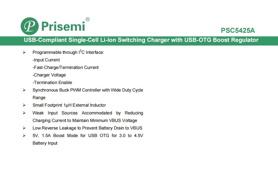作为 Prisemi 授权代理商,我们荣幸地向您推荐——业界高度集成的单节 Li-ion 开关型充电器暨 USB-OTG 升压稳压器 PSC5425A。该器件集成度高、效率出众,可显著缩短充电时间、简化设计、降低 BOM 成本,是智能手机、平板、可穿戴与各类便携设备的理想电源管理方案。